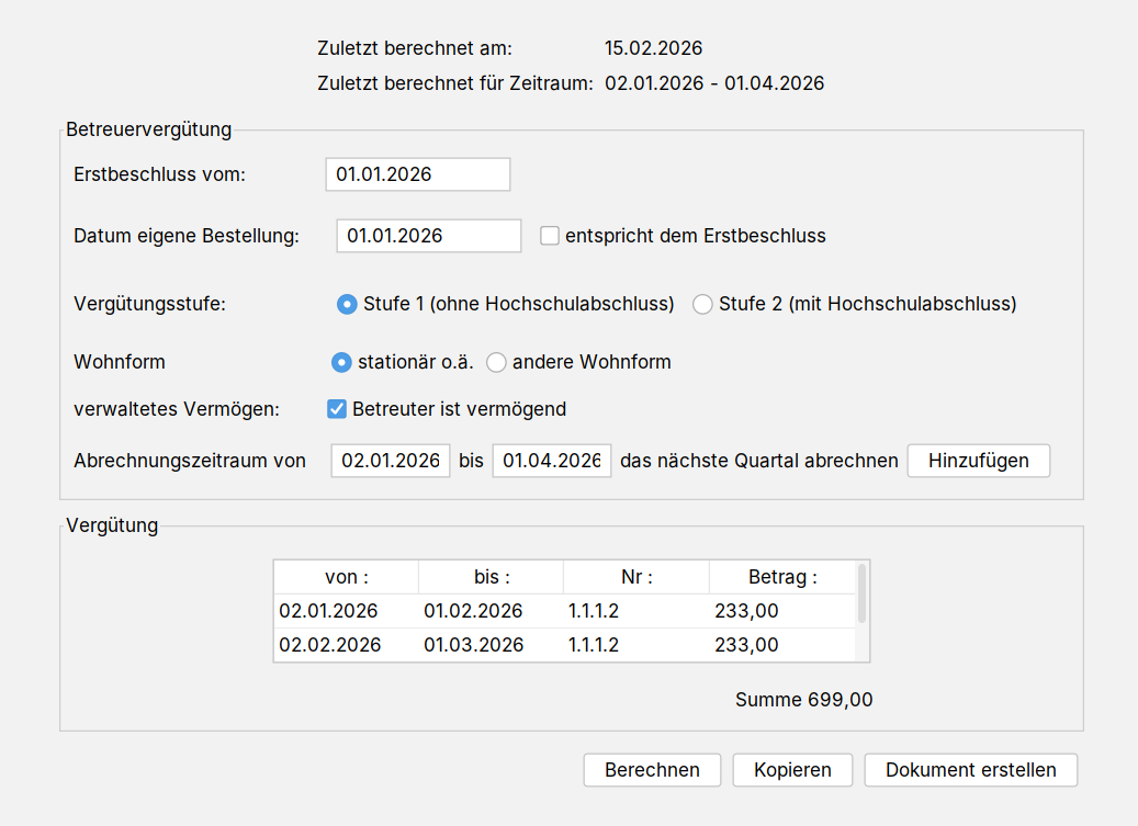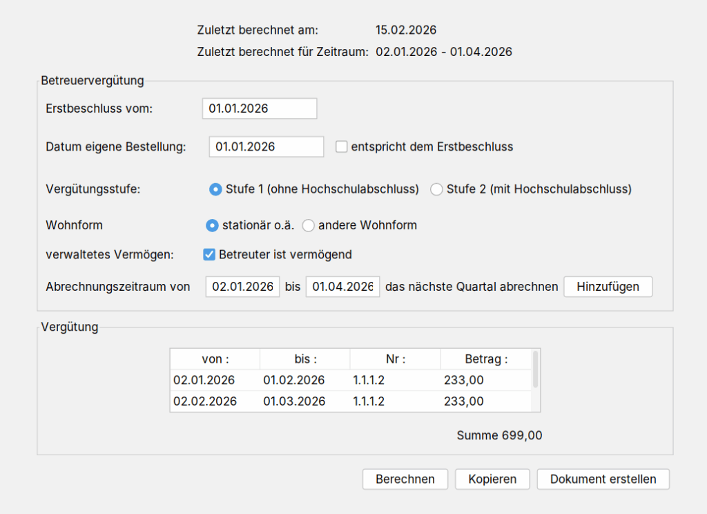Ab sofort steht ein neues Falldatenblatt zur Abrechnung von Betreuungen (Abrechnungszeiträume ab 01.01.2026) zur Verfügung. Es sind die derzeit gültigen Berechnungsvorschriften umgesetzt.